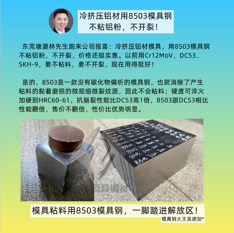 8503跟DC53相比,抗崩裂性能高1倍,性能翻倍,售價不翻倍,性價比優(yōu)秀明顯,還多了不粘料的好處。就像東莞塘廈林先生說的,冷擠壓鋁材模具用8503模具鋼,不粘鋁粉、不開裂、價格還挺實惠。