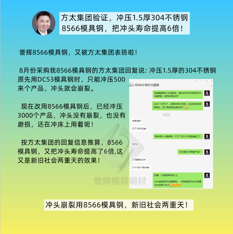 譽輝擁有專有合金成分的8566防崩鋼,它的抗崩裂性能是高速鋼SKH-9的4倍,D2的兩倍,硬度HRC58-60;它能解決D2、DC53、SKH-9等高硬度模具鋼,無法解決的崩裂問題。方太集團驗證,沖壓1.5厚304不銹鋼,8566模具鋼,把沖頭什么提高6倍,這話6倍的增長,又是新舊社會兩重天的效果。