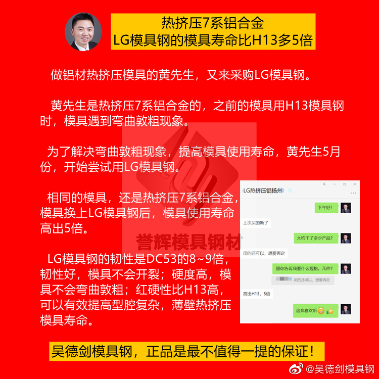 LG模具鋼的韌性是DC53的8-9倍,硬度有HRC54-58,韌性好到你敲彎它也不斷裂,因?yàn)橛捕雀?,韌性好,又耐熱,用于齒輪紅沖模具,過往的案例經(jīng)驗(yàn)絕對不止這2000-3000個模次,而且模具修模之后,它的壽命不減的,他買的LG模具鋼,雖然名字跟我一樣,案例跟我一樣,文案跟我一樣,連LG模具鋼這個型號都一樣,但是材質(zhì)不一樣,這種四抄的模具鋼,解決不了模具的問題,只能讓你多花錢來多交學(xué)費(fèi),這沒有辦法,還是要換吳德劍LG模具鋼這個品牌才行。