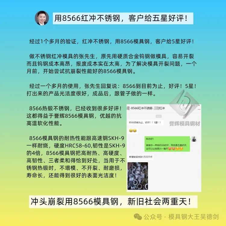 而且跟何先生說的一樣,YXR33的價(jià)格實(shí)在是太貴了,我是沒辦法才選擇它的,因?yàn)镠13很快塌模,沒辦法量產(chǎn),是逼的沒辦法選擇。現(xiàn)在找到8566模具鋼,效果已經(jīng)驗(yàn)證出來了,我們的技術(shù)對(duì)這款材料也認(rèn)可了,我們以后的不銹鋼熱鍛模具的沖頭,應(yīng)該會(huì)大批量采用8566模具鋼。何先生今天下午又來采購8566模具鋼。