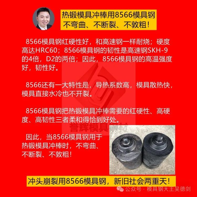 做熱鍛模具的何先生驗(yàn)證,不銹鋼熱鍛沖頭用8566模具鋼效果比YXR33強(qiáng),沖頭用8566模具鋼,在韌性、耐熱性能、耐磨性這3方面更勝一籌。借此機(jī)會(huì),我也可以告訴你,熱鍛模具沖頭用什么模具鋼好?熱鍛模具沖頭用8566模具鋼,耐熱不開裂,沖頭越打越亮,其他模具鋼做不到。