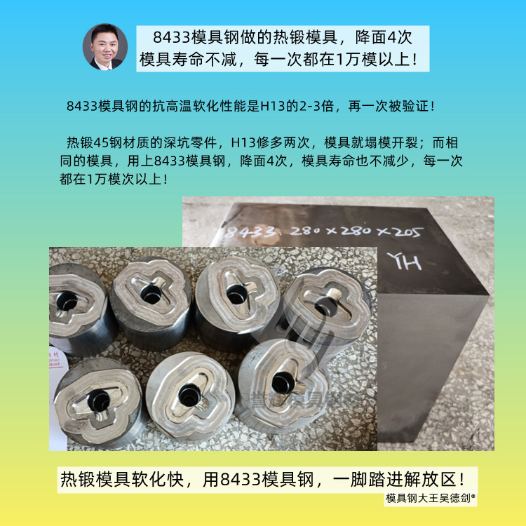 如果你的熱鍛模具也遇到塌模和開裂的現(xiàn)象,像該網(wǎng)友一樣,模具壽命短的,你想延長模具使用壽命長度的,你是上了自動化的,老換模具,對你效率的損失傷害大的,你接受不了,那你來用耐熱鋼8433模具鋼吧。熱鍛模具遇到塌模和開裂,用8433模具,比這紅燒肉還香。