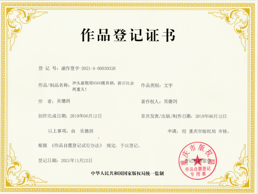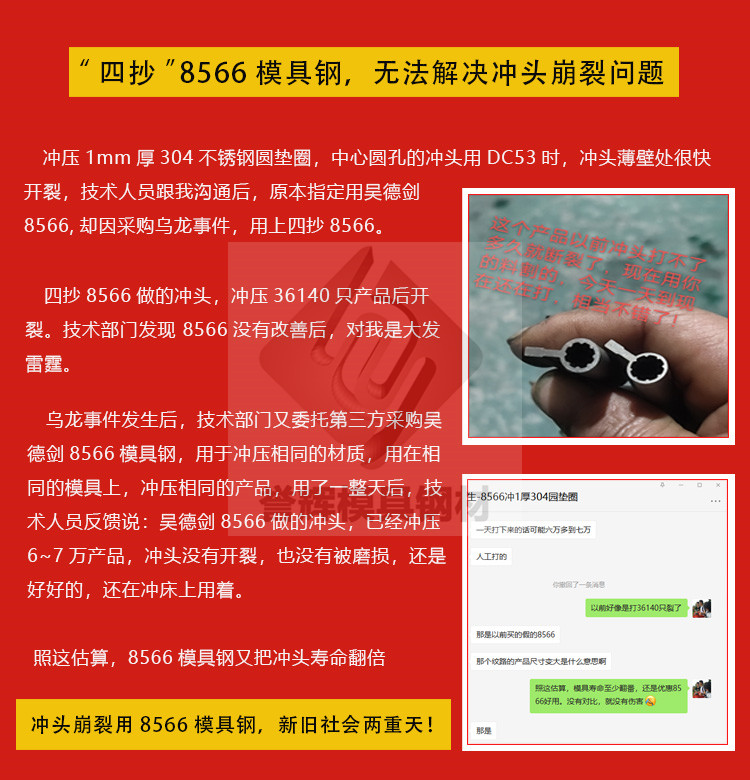 但是四抄8566沒(méi)辦法解決你模具的崩裂問(wèn)題,它只是會(huì)讓你多花錢(qián)來(lái)多交學(xué)費(fèi),但是吳德劍8566模具鋼它是能夠解決你沖頭崩裂問(wèn)題的,并且能夠成倍的提高模具使用壽命的長(zhǎng)度,讓你的沖壓生產(chǎn)實(shí)現(xiàn)低成本、高效率、長(zhǎng)壽命的生產(chǎn),沖頭崩裂用8566模具鋼,新舊社會(huì)兩重天,但不包含四抄8566和影子8566。