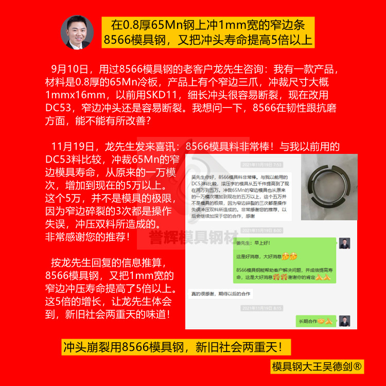 是的,按照龍先生回復(fù)的信息推算,8566模具鋼又把這窄邊條65錳鋼的模具壽命,由原來的10000沖次提高到50000沖次,這5倍的增加,又是新舊社會(huì)兩重天的效果。